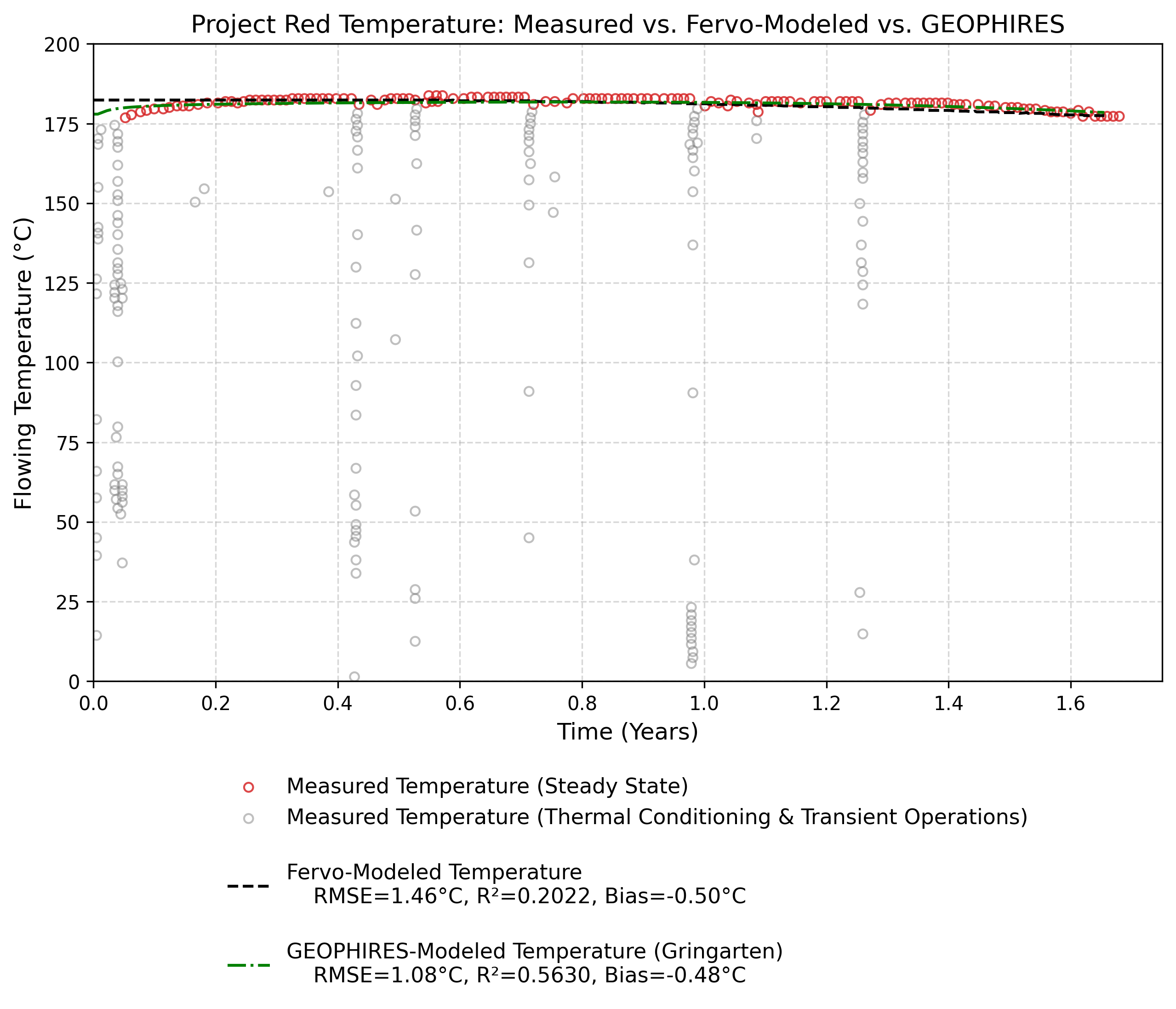 R² Context: While the Fervo model yields a relatively low R² (0.2022), GEOPHIRES achieves a stronger R² of 0.5630, indicating it more successfully captures the underlying physical trend of the data (the slight thermal drawdown) rather than simply averaging the noise. However, it is important to note that the absolute R² ceiling for both models is inherently suppressed by the dataset. Because the steady-state temperature profile is essentially a flat plateau, natural sensor variance and minor reservoir oscillations may account for a disproportionately large portion of the total variance, keeping the R² scores modest despite the favorable absolute error (RMSE).