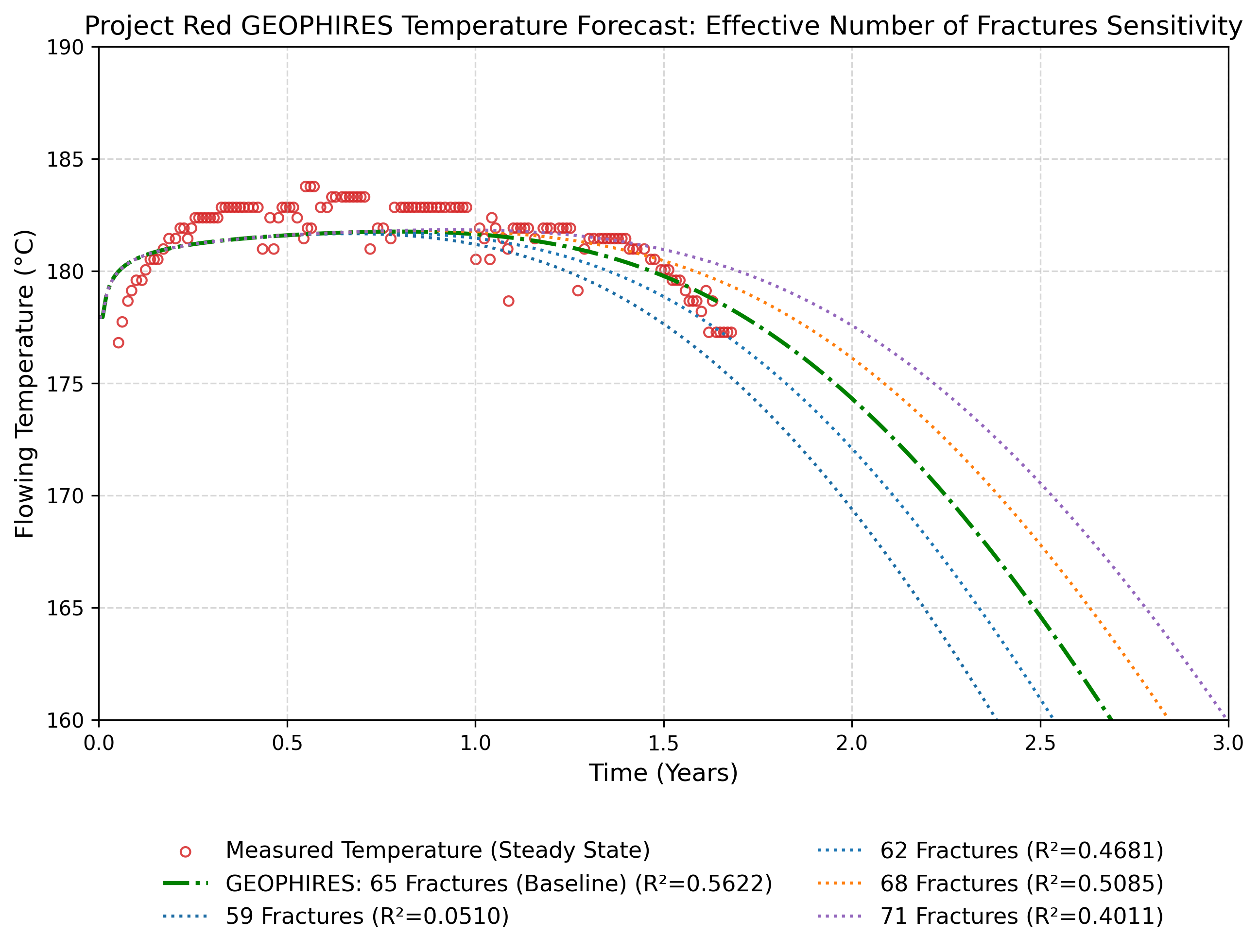 Because Fervo has explicitly characterized this two-year operational period as demonstrating highly stable flowing temperatures with marginal to no actual reservoir drawdown, the GEOPHIRES parameterization deliberately favors a stabilized, slightly more optimistic decline curve rather than overfitting to potential extraction artifacts.