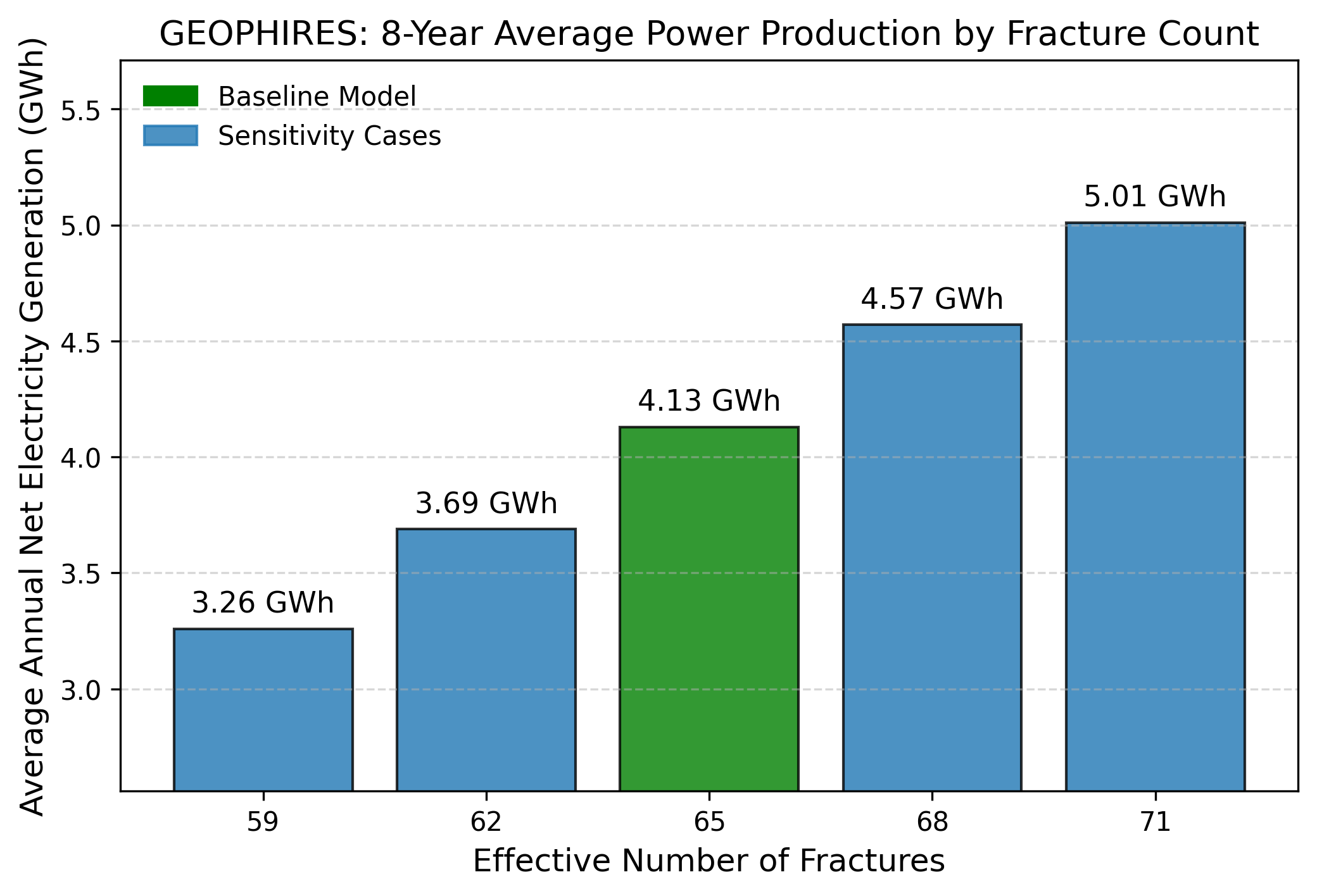 To further quantify the impact of these varying fracture geometries, the corresponding average annual net electricity generation over the 8-year horizon was also evaluated. While the flowing temperatures across all sensitivity cases essentially converge by year 8, their distinct intermediate thermal decline paths result in measurable differences in total power output. Utilizing Average Annual Net Electricity Generation (GWh) isolates these aggregate differences, providing a relative basis for comparing the lifecycle performance of each sensitivity case.