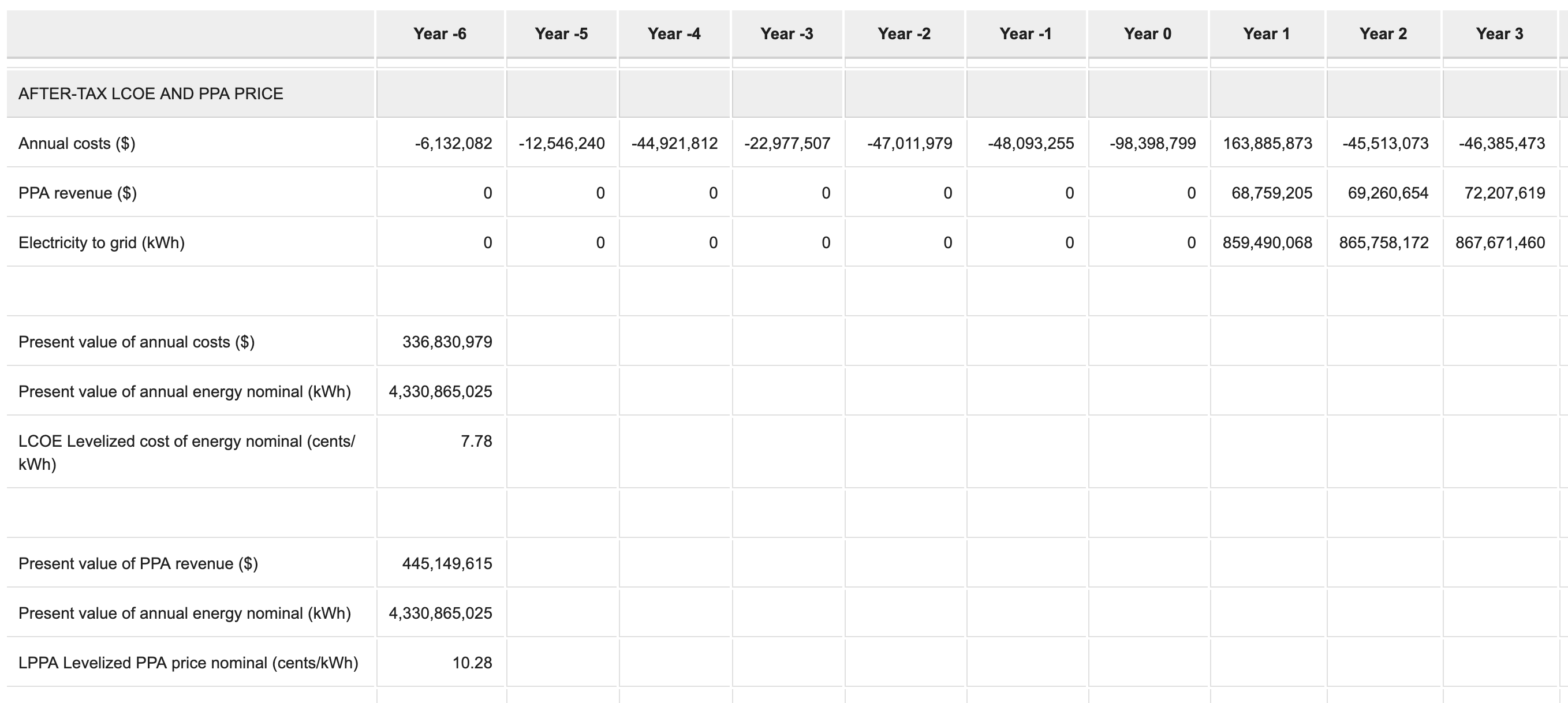 Line items in the AFTER-TAX LCOE AND PPA PRICE category are post-processed to yield timeline-adjusted LCOE and LPPA.